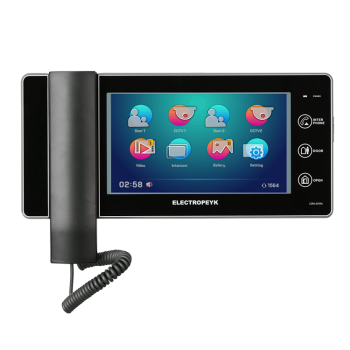 این محصول دارای صفحهی نمایش ۷ اینچ از نوع اینولوکس با قابلیت اتصال به دو صفحهی تصویری و دو دوربین امنیتی، امکان بازبینی تصاویر، ویدئوهای ذخیرهشده با صدا، ظرفیت حافظه تا ۱۶ گیگابایت، ارتباط داخلی صوتی به یک گوشی تصویری است. از دیگر امکانات این محصول قابلیت تنظیم نور، صدا و رنگ است. رابط گرافیکی محصول از نوع OSD است که در آن کاراکترهای گرافیکی بهصورت نوشتاری بر روی صفحهی نمایش قرار دادهشده است. در تولید بردهای الکترونیکی محصول از فنّاوری SMT با پکیج ۰۶۰۳ استفادهشده است. همچنین فیبر بردهای الکترونیکی از نوع KB۶۱۶۰ است. برای محصول چیپ حافظه برای ۹ ملودی اختصاصی الکتروپیک قرار دادهشده است.